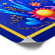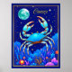 Poster in an illustration of the Cancer zodiac sign featuring a large, blue crab with orange accents set against a starry night sky. A glowing full moon hovers above, while colorful, dreamlike sea flora fills the foreground.