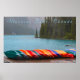 Une rangée de canoës colorés se trouve sur un quai en bois, face à un lac serein de la Moraine, Canada, entouré d'arbres verdoyants. L'eau est d'un bleu turquoise éclatant, reflétant le ciel couvert. L'arrière - plan dispose d'une chaîne de montagnes brumeuse, ajoutant un sentiment de tranquillité à la scène.