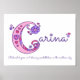 Poster de nom d'art en monogramme, joli C, parfait pour une chambre pour filles ou salle de jeux dans les tons rose et violet. Personnalisez avec votre propre nom commençant par C et nom signifiant pour une touche vraiment personnalisée à la chambre ou à la crèche de votre fille. Cette affiche porte le nom de Carina Beloved & pure. Une constellation brillante dans le ciel du sud. Mignonne affiche idéale pour un nouveau bébé, un baptême ou un cadeau de baby shower. © Lettre unique C monogramme coeurs et fleurs dessin et graphisme par Sarah Trett. www.sarahtrett.com pour www.mylittleeden.com