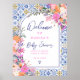 Notre motif en céramique bleue d'inspiration italienne-méditerranéenne, jumelé à des fleurs sauvages d'aquarelle pastel peints à la main et joyeux, crée un panneau d'accueil de baby shower frais et moderne qui ne manquera pas d'impressionner ! Doté d'une arche moderne et d'un élégant script de brosse. Impressionnez vos invités avec ce design tendance et unique qui fera parler tout le monde.