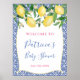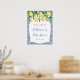 Citrons et fleurs aquarelles sur fond de motif de carreaux bleus cobalt et blancs pour ce panneau de bienvenue de douche de mariage ou de bébé chic.
