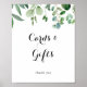 Cette pancarte de cartes et cadeaux botaniques d'eucalyptus vert est parfaite pour un mariage rustique ou une fête de mariage. Le design présente de belles feuilles d'eucalyptus vertes artistiquement peintes à la main, assemblées en bouquets nets pour embellir votre événement.