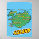 Carte de style pop art d'Islande avec un arrière - plan bleu vif et un motif pointillé. La carte elle-même est verte avec des contours noirs et présente diverses villes et villes marquées de points rouges et de bulles de discours jaunes. Les noms des villes sont écrits en caractères blancs gras à l'intérieur des bulles de discours.