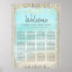 Aidez vos invités à trouver leur siège avec ce tableau de sièges à poster mariage, avec un bel arrière - plan de plage d'aqua encadré de bois patiné rustique, avec des lampes à cordes au sommet.