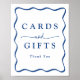 Ajoutez une touche élégante à votre mariage, à votre douche nuptiale, à votre baby shower, à votre remise de diplômes ou à tout autre événement spécial grâce aux cartes et aux cadeaux Modern Blue Wavy Frame. Le design comporte des "Cartes et Cadeaux" en lettres bleues et en gras entourées d'une bordure bleue ondulée, contrastant avec un arrière - plan blanc. Personnalisez les cartes rétro et les cadeaux signer avec votre texte personnalisé ci-dessous. Choisissez entre des options d'impression professionnelle ou de téléchargement instantané, offrant une flexibilité pour votre commodité.