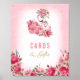 C'est le panneau Cartes et Cadeaux pour le baby shower. Le design est un flamant rose chéri, ballerine, maman et petite fille, avec des couronnes de rose rose rose sur la tête et un bouquet de rose plus grand à côté des corps. Arrière - plan rose doux avec de mignons triangles dorés. Centre blanc avec fleurs roses au bord inférieur.