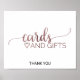 Cette affiche simple de cartes et de cadeaux en or rose est parfaite pour un mariage moderne. Le design minimaliste présente une élégante police de caractères cursive et un cœur féminin charmant en faux feuillet or rose. La ligne de texte au bas du panneau peut être personnalisée avec la date, les noms des mariés ou un court message comme "Merci".