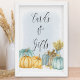 Panneau Cartes & Cadeaux d'automne - parfait pour une baby shower d'automne, une douche de bride, un anniversaire, un mariage, etc. Lettré avec "Cartes & Cadeaux" en calligraphie mignonne et décoré avec des citrouilles aquarelles, un panier en bois rustique et un pichet de blé sur un lavis aquarelle bleu. Veuillez parcourir ma boutique - collection country pumpkin - pour les invitations et la décoration de fête assorties.