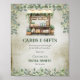 Magnifique conception d'affiche "Cartes et cadeaux" pour le marché fermier avec une forêt et une eucalyptus de couleur vert sauge. Un fond avant vieilli rustique combiné avec un présentoir en bois recouvert de verdure et l'eucalyptus suspendu environnant rappelle un marché italien ou campagne à ciel ouvert.