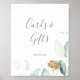 Cette enseigne cartes et cadeaux à feuilles dorées et verdure aérée est parfaite pour un mariage moderne ou une fête de mariage. Le design botanique élégant présente un eucalyptus aquarelle léger et aéré rehaussé de feuilles de pailleur dorées fantaisistes. La ligne de texte au bas de l'enseigne peut être personnalisée avec la date, les noms des mariés ou un court message comme "Merci". Cette enseigne peut être utilisée pour un mariage ou tout événement ou fête.