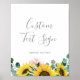 Cette pancarte personnalisée avec texte personnalisé et tournesols rustiques est parfaite pour un mariage champêtre. Le design floral bohème présente des tournesols jaunes, des fleurs rose saumon et du feuillage de eucalyptus vert chasseur dans un style aquarelle avec une touche moderne et élégante. Personnalisez le texte pour dire ce que vous voulez ! Cette pancarte peut être utilisée pour les cartes et les cadeaux, le livre d'or, le mot-clé de mariage, les faveurs, le bar à dessert - tout ! Elle peut être utilisée pour un mariage, une douche de mariée, un dîner de répétition ou tout événement. La ligne de texte au bas de la pancarte peut être personnalisée avec la date, les noms des mariés ou un court message comme "Merci". Si vous souhaitez plusieurs pancartes coordonnées, personnalisez et ajoutez-les à votre panier une à la fois.