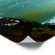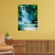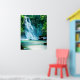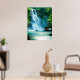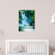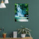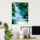 Poster sur l'illustration d'une cascade en bleu pâle avec spray blanc, entourée de rochers et de feuilles verts