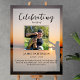 Laffiche de souvenir parfaite pour saluer la famille et les amis à leur arrivée à la célébration de la vie de votre proche. Le design présente une photo personnelle carrée, 5 lignes de texte personnalisé et une photo de fond d'une personne pêchant au coucher du soleil. Vous pouvez facilement la remplacer par votre propre photo de fond. Classique mais unique - ce modèle est si facile à personnaliser et fera également un excellent souvenir souvenir.