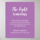 Cette élégante pancarte commémorative lavande et blanche, avec sa touchante citation "La lumière reste" est une belle façon de se souvenir et d'honorer l'être cher lors de la célébration de la vie. Personnalisez avec votre texte en bas.