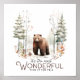 Ce design boisé de Noël d'inspiration nature et cosy présente le texte "c'est le moment le plus merveilleux de l'année." Au-dessus du texte se trouve un ours brun dans une forêt d'hiver. Cette scène animalière boisée est parfaite pour ajouter une touche de nature enneigée à votre décor de maison de vacances.