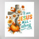Design paisible et coloré avec une scène automne/automne avec un citrouille, croix en bois, papillons et fleurs automne. Le texte inspirant et coloré dit : "C'était Jésus depuis le début". Ce design est disponible sur une grande variété de produits.