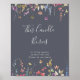 Cette enseigne de bougie florale sauvage bleue classique est parfaite pour un mariage rustique. Le design présente des fleurs sauvages jaunes, violettes et blanches avec du feuillage sur un fond de peinture à l'eau rose et vert.