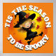 C'est la saison pour être éffrayant et une mignonne sorcière dans un casquette noir danse dans les feuilles d'automne.