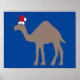 Cette affiche présente une image art numérique d'un mignon chameau dromédaire couleur sable brun avec de belles cils longs et une seule bosse sur le dos. Le chameau est habillé pour fêter Noël avec un chapeau de Père Noël rouge et blanc sur la tête. Le chameau figure dans la Bible et est un symbole traditionnel de Noël.