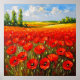 Une représentation artistique vibrante d'un champ panoramique en fleurs avec des coquelicots rouges. Une végétation luxuriante entoure ce paysage vivace sous un ciel bleu pittoresque avec des nuages blancs épars, évoquant la tranquillité et la beauté de la nature.