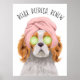 Affiche d'art drôle et motivationnel avec une illustration peinte à la main d'un Chien Roi Charles Espagnol obtenant un visage avec un bandeau rose et des tranches de concombre. Le texte en haut dit "détendre, rafraîchir, renouveler". Parfait pour un spa ou votre salon.