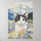 Une illustration époustouflante d'un chat noir et blanc avec une hétérochromie saisissante - un œil doré et un œil bleu - entouré de fleurs sauvages vibrantes en jaune, violet et blanc. La chaîne de montagnes majestueuse en arrière-plan et la verdure luxuriante complètent cette scène captivante et paisible.