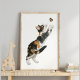 Affiche Chat calicot fantaisiste et papillon en art aquare