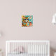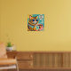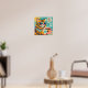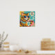 Chaton de dessin animé rétro portant des lunettes de soleil surdimensionnées, tenant une tasse de café. Couleurs audacieuses inspirées des années 80 (turquoise, moutarde, corail) avec un fond texturé en demi-teinte et une touche ludique