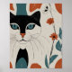 chat blanc et noir bordé d'yeux bleus entouré de fleurs colorées.