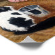 Un chat tuxedo à poils longs noir et blanc est assis dans une grange et regarde une vache noire et blanche avec du veau. Attend-il du lait dans le seau brillant en argent ?