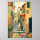 Ce design animé représente un chat coloré perché sur le côté d'un escalier raide dans un village méditerranéen pittoresque. Le style fantaisiste saisit l'essence ludique du chat, tandis que l'utilisation de couleurs audacieuses et vibrantes donne vie à la scène de rue. Les tons chauds d'orange foncé et d'émeraude claire évoquent les couleurs des maisons méditerranéennes, ajoutant au charme de la pièce. Dans l'ensemble, ce travail est un bel exemple du pouvoir de la couleur et de la fantaisie dans la création de scènes de rue captivantes.