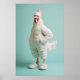 Un poulet fantaisiste et anthropomorphe habillé d'un costume blanc moelleux, de chaussons confortables et d'une beanie. Avec une attitude confiante et un arrière - plan pastel doux, ce caractère surréaliste mêle humour et créativité, créant un visuel unique et attrayant pour un amateur de poulet ou de pâques
