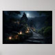 Illustration numérique d'un chemin sinueux en pavé à travers une vallée profonde au clair de lune et éclairée par des lanternes jusqu'à d'anciens temples chinois au-dessus de rochers survoltés. Réalisé à l'aide d'algorithmes génératifs et Photoshop. Il s'agit d'un autre design 100% original Snuggle Hamster.