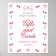 Cadeaux, cartes et beaucoup d'amour ! 🍒 Ce panneau magnifiquement conçu, avec des cerises d'aquarelle et de délicates fleurs roses, guide les clients à l'endroit parfait pour laisser leurs cadeaux réfléchis. Une touche design et fonctionnelle pour votre installation de baby shower !