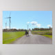 "Horse Buggy and Wind Turbines, New York" de Catherine Sherman. Un homme dans un casquette en paille conduit une voiturette tirée par des chevaux sur une route de campagne, au-delà des pâturages et des champs agricoles dans le nord de New York. Les éoliennes montent au-dessus.