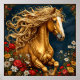 Image enchanteresse d'un cheval doré à la crinière flottante ornée de fleurs pastel, évoquant la beauté et l'élégance. Montre des détails et du charme, attirant les amateurs de nature et d'équitation.