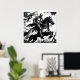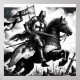 Un puissant chevalier croisé, vêtu d'une armure et portant un bouclier transbordé, mène ses troupes dans la bataille à cheval. L'image est rendue en noir et blanc, mettant l'accent sur le drame et l'intensité de la scène.