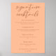 Peach est la nouvelle couleur tendance pour un événement d'été avec une barre ouverte. L'affiche du menu des cocktails mariages de pêche sucrés présente un élégant script marron clair détaillant vos boissons pour un événement tendance et minimaliste dans l'après-midi. Grande impression pour une mariée féminine qui aime rester à jour et moderne.