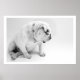 Photo d'un bulldog anglais blanc assis, regardant en bas.