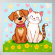 Une illustration joyeuse d'un chien et d'un chat amis assis ensemble sur de l'herbe verte entourés de fleurs et de cœurs colorés, symbolisant l'amitié et le bonheur.