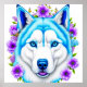 Chien mignon Husky aux yeux bleus et aux fleurs violettes à l'art.
