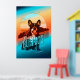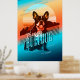Design d'affiche de style rétro frappant d'un Bulldog français avec un arrière - plan de montagnes et grand soleil graphique le tout dans une palette de couleurs frappante d'orange brûlé à travers turquoise et . or. Une grande police décorative nomme la race de chien. Recherchez ID754 pour voir d'autres options de couleur et d'autres races de chiens dans ce style.