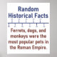 L'histoire est fascinante. Découvrez votre fascination pour ce fait historique : les furets, les chiens et les singes étaient les animaux les plus populaires de l'Empire romain. Idéal pour les amateurs de futilités et d'histoire.