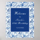 Jolie pancarte de bienvenue pour une fête d'anniversaire avec des oiseaux et des fleurs de style chinoiserie bleue. Parfait pour un mariage de printemps ou d'été. Les mots peuvent être modifiés pour s'adapter à vos propres détails ou exigences.