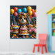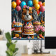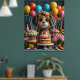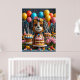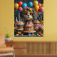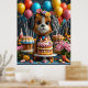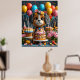 Un chien mignon orné d'une couronne de fleurs profite d'une fête d'anniversaire vibrante avec des gâteaux colorés, des ballons et des décorations joyeuses, évoquant la joie et la célébration dans une atmosphère festive.