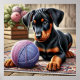 Un mignon chiot doberman jouant avec une boule de fils colorée sur un tapis à motifs. Le décor dégage chaleur et charme, et vous invite à passer un moment de divertissement dans un cadre chaleureux et familial.