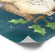 Deux chouettes beiges brunes mignonnes aux yeux oranges assis sur une branche d'arbre brun avec des feuilles verts la nuit. L'arrière - plan est bleu foncé avec des points blancs qui ressemblent à des étoiles. Les hiboux se regardent. Celui de gauche porte un béret rose avec des points rouges dessus. Le hibou à droite porte un chapeau de santa rouge et blanc.