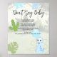 Chic et élégant Shhh ne dit pas bébé signe. Un panneau de jeu de baby shower, avec un dessin de bébé dinosaure et ballon bleu. Customisez facilement les mots pour en faire le vôtre. Ce design peut également être utilisé pour la douche nuptiale, mariage, anniversaire, il suffit de changer les mots pour correspondre à votre événement. Visitez notre collection Blue Dinosaur pour les articles de fête correspondants. Serviettes, cartes de remerciements, panneaux d'accueil et plus encore.