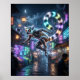 A playful circuit lemur leaps through a lively futuristic moon market, formed from agile metallic musculature, glowing tail rings, and luminous facial markings. White, cyan, lime, violet, and warm amber accents bring vibrant energy to its expressive eyes and dynamic movement. Lantern drones, holographic fruit stalls, rooftops, hanging cables, neon signs, reflective stone paths, and misty night atmosphere create a rich urban setting. This joyful cyber lemur design is perfect for gaming rooms, kids spaces, offices, and unique animal gifts.
