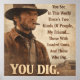 Un cow-boy rude fume un cigare tandis qu'une citation célèbre sur les armes et le creusement est affichée. Le ton sépia donne une atmosphère vintage à l'image.